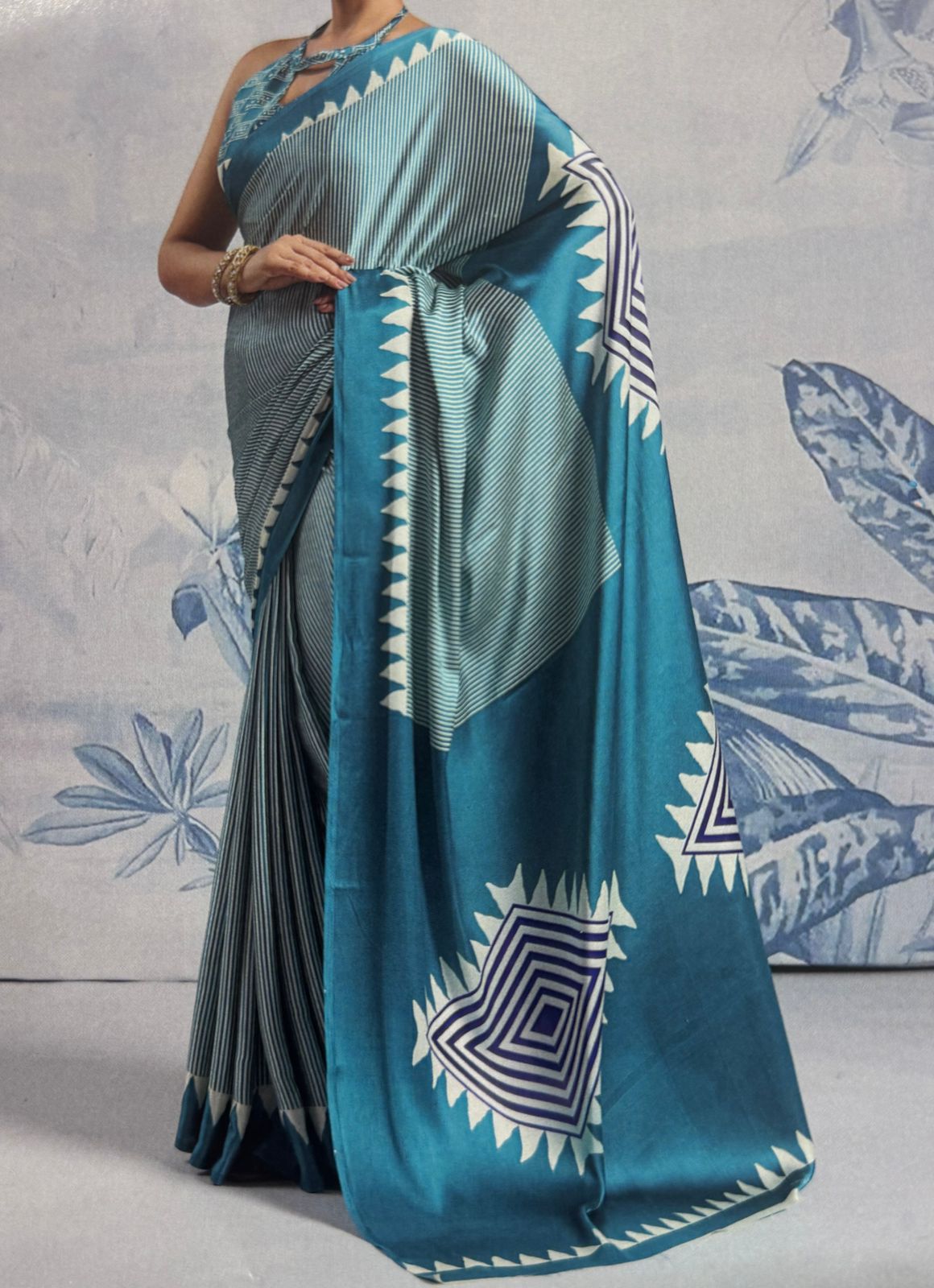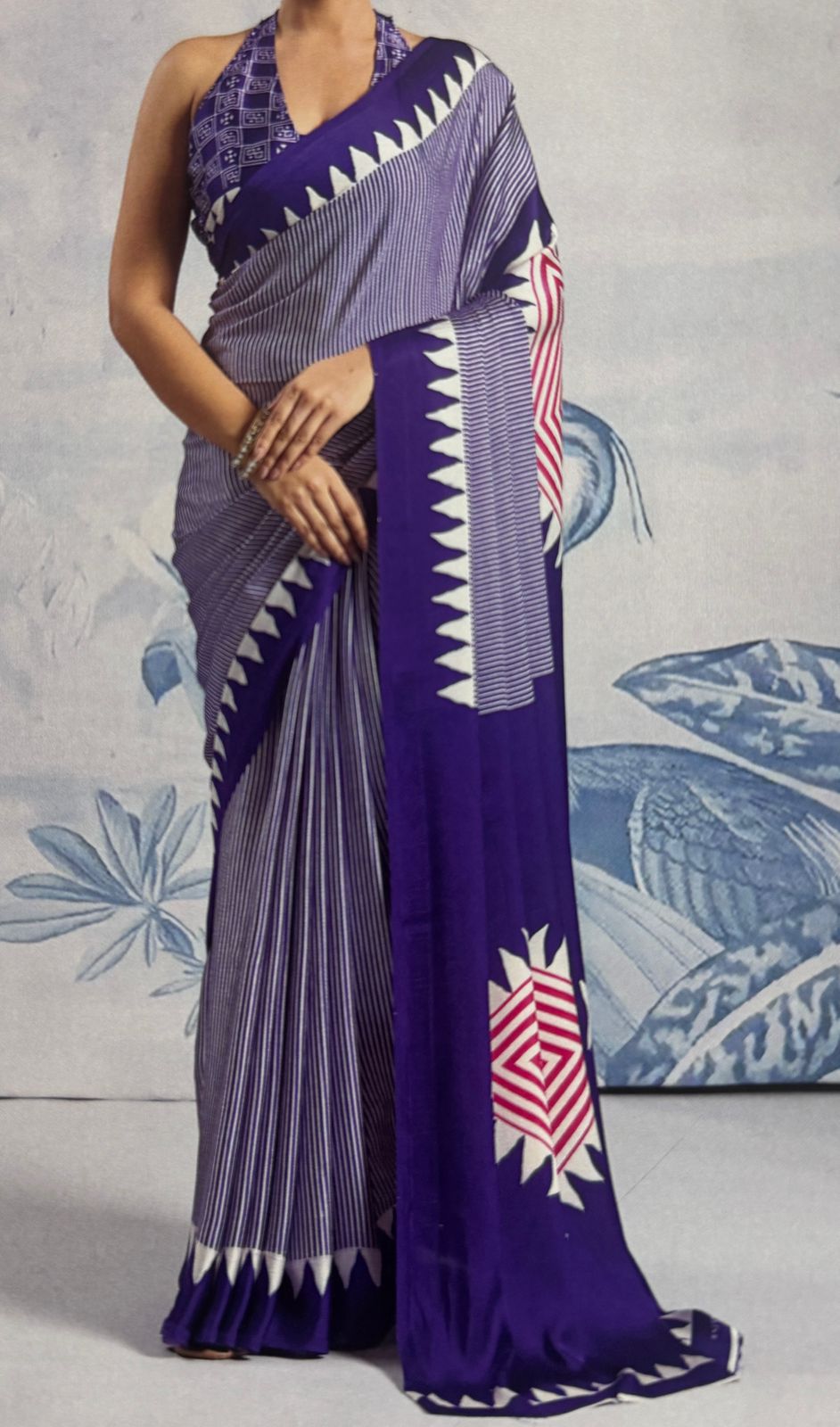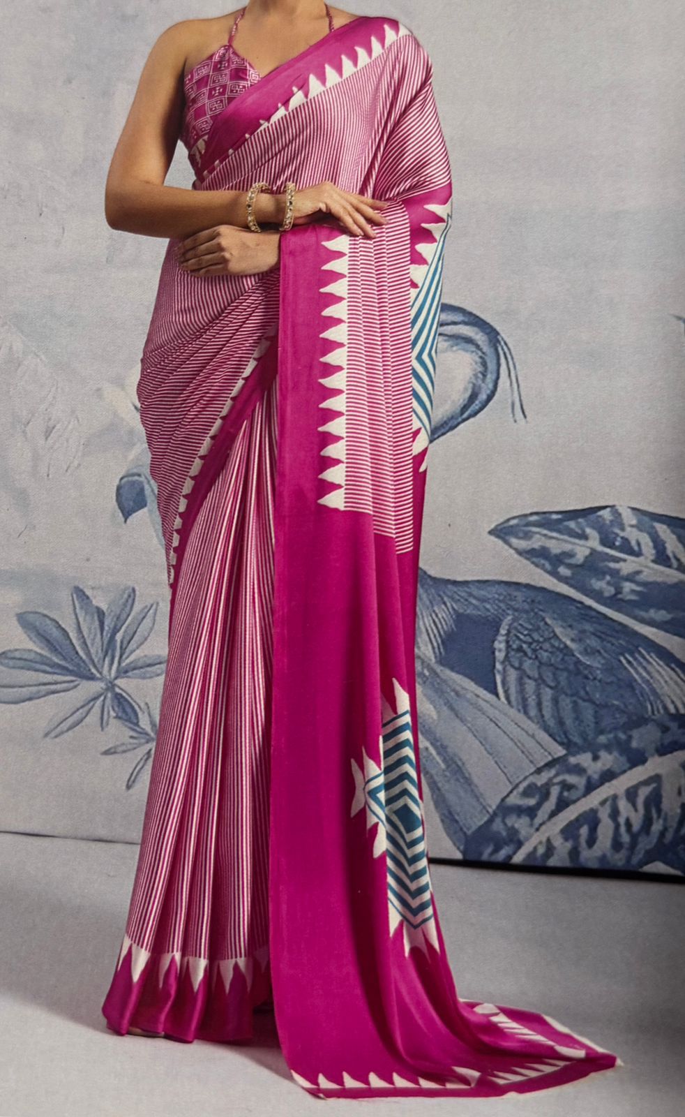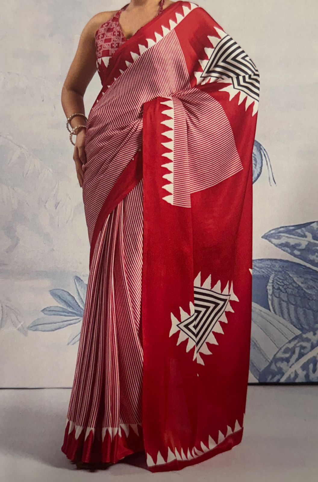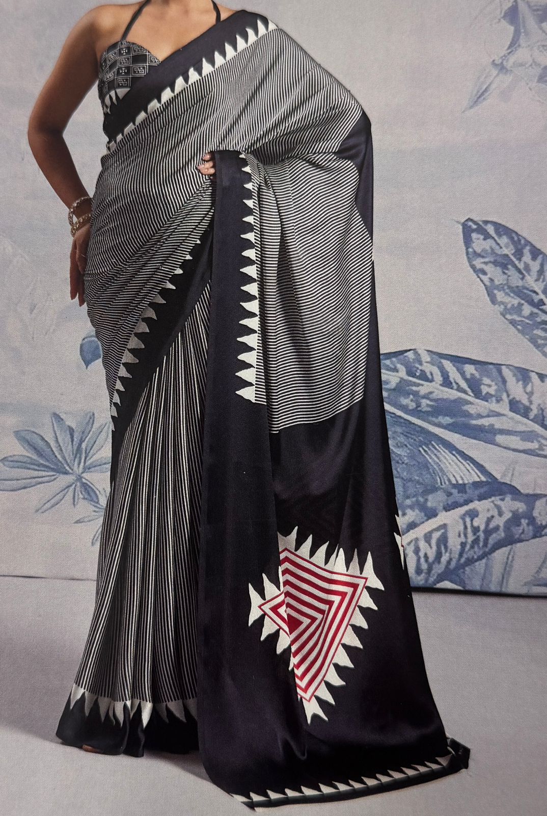 * Make a bold statement in this super-hit Satin Ajrak Saree, featuring a gorgeous pallu and an elegant contrast blouse. Soft, stylish, and completely washable!