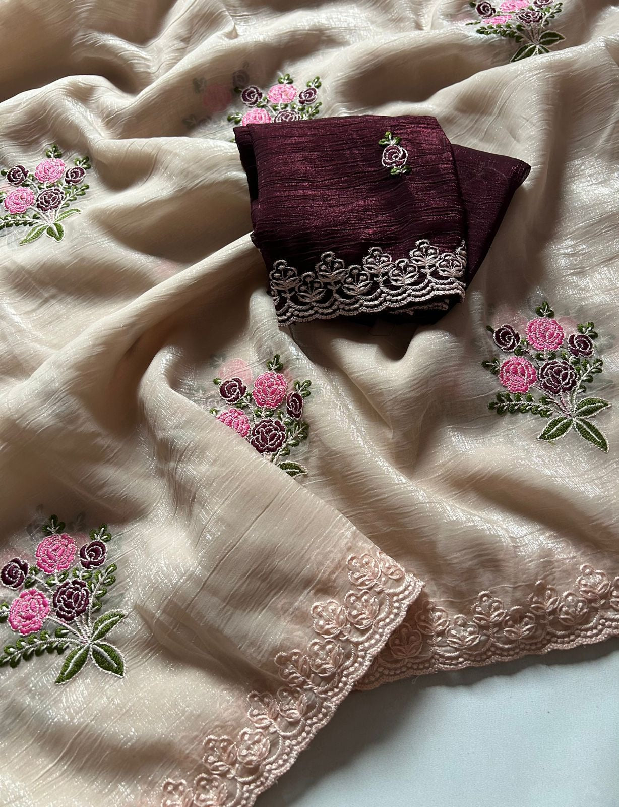 “Turn heads in this party-ready beige saree with a delicate scallop border, paired with a wine blouse featuring matching scallop detailing. Lightweight, stylish, and easy-care with water wash. Grab yours for just ₹1350 with free shipping!”