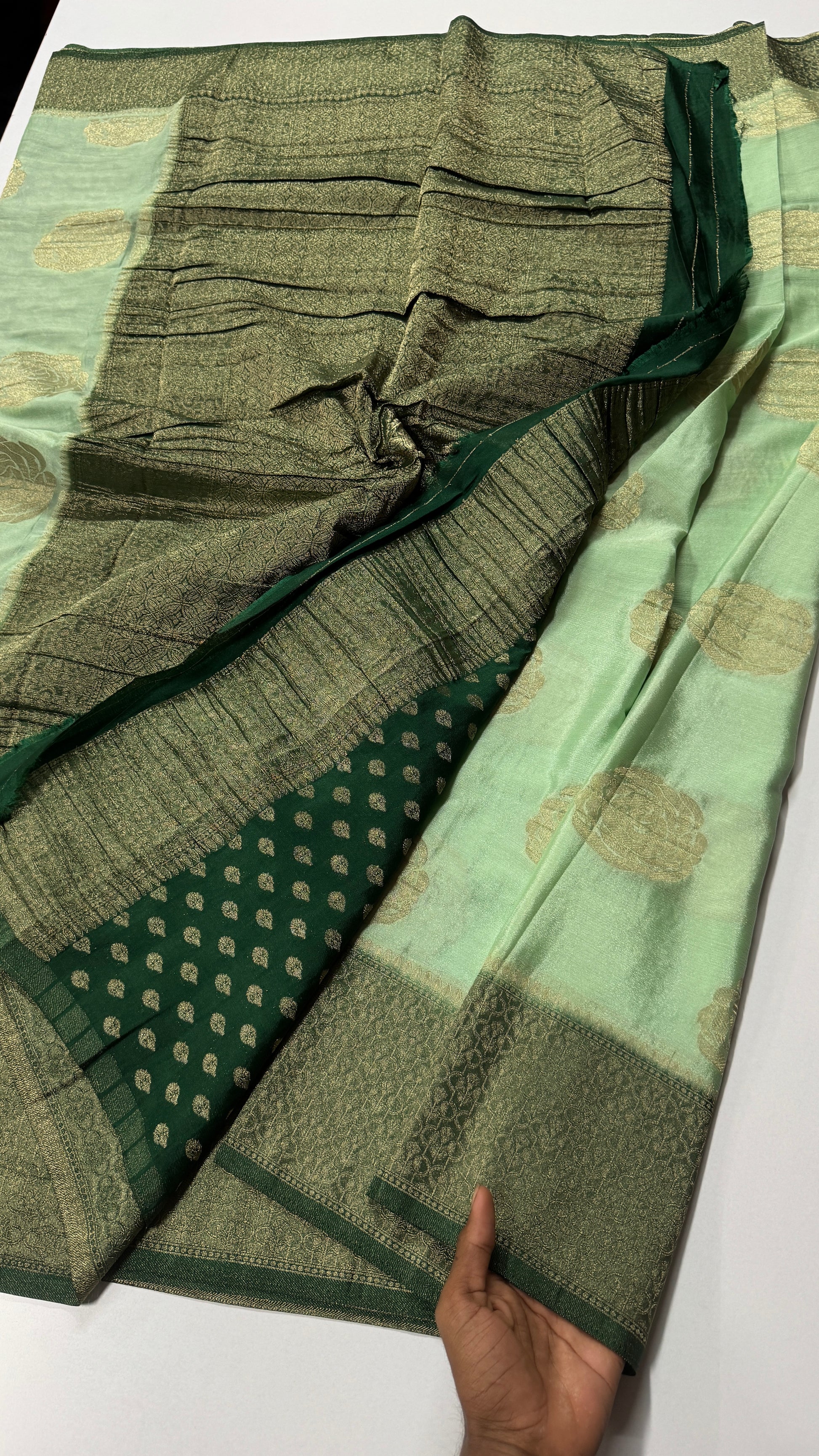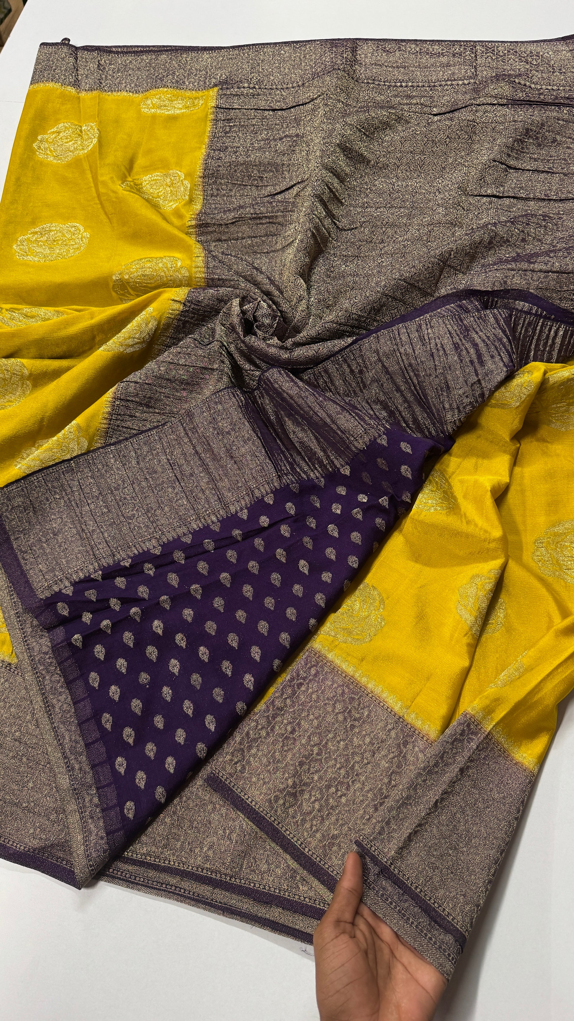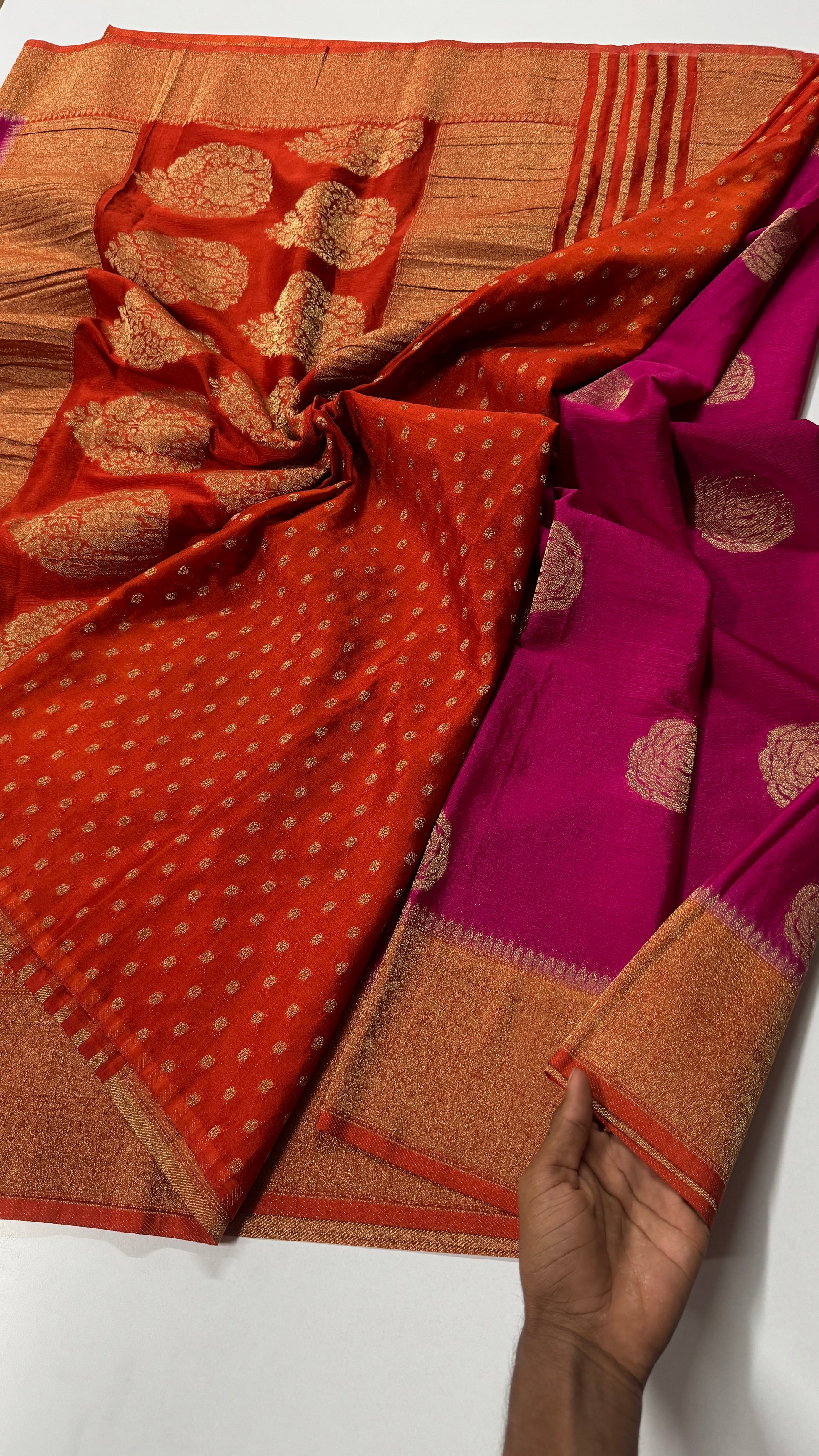 This Georgette Crepe Rose Butta Saree tells its own story with delicate buttas scattered like blooming roses, paired with a graceful border blouse that completes the look effortlessly.