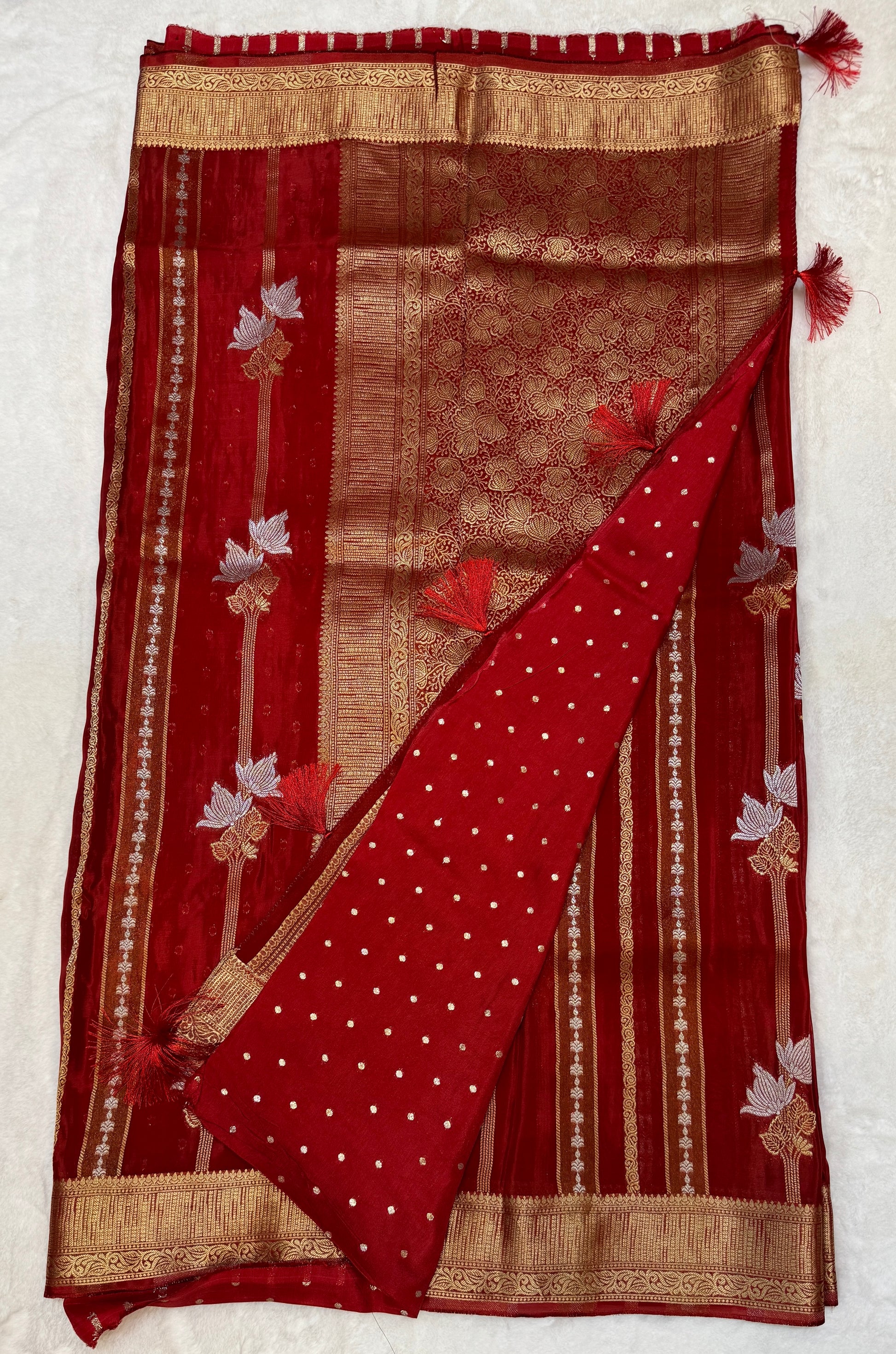 Step into elegance that glows - this Viscose Organza saree features luxurious silver and gold zari weaving, giving it a radiant finish that catches the light effortlessly.